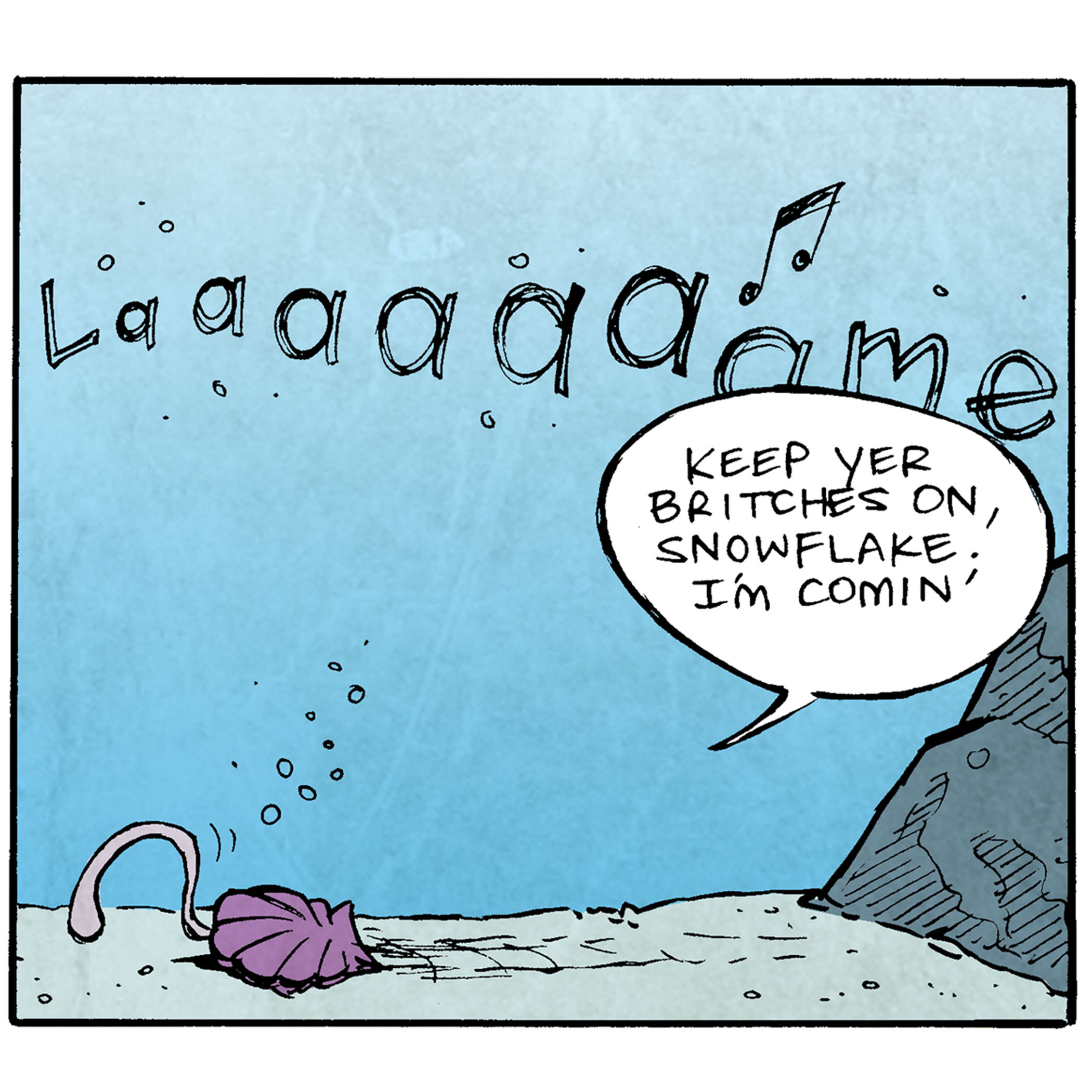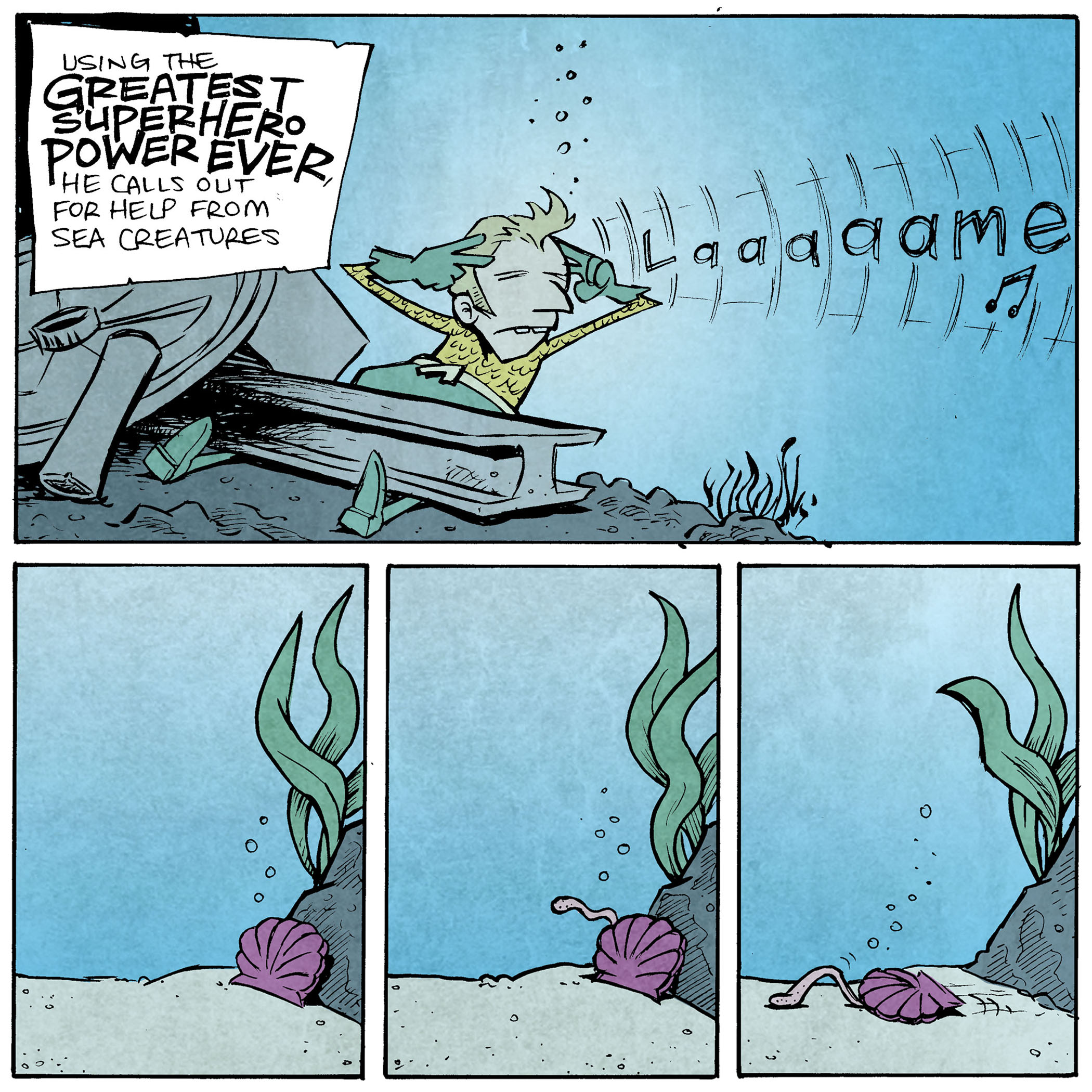 PANEL 5: Aquaman’s “laaaaaame” floats through the ocean in the background. The shell slowly makes its way across the seafloor.