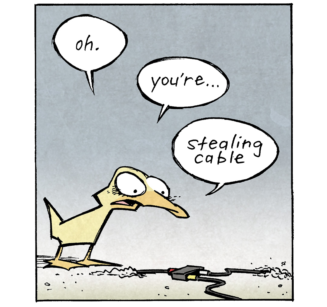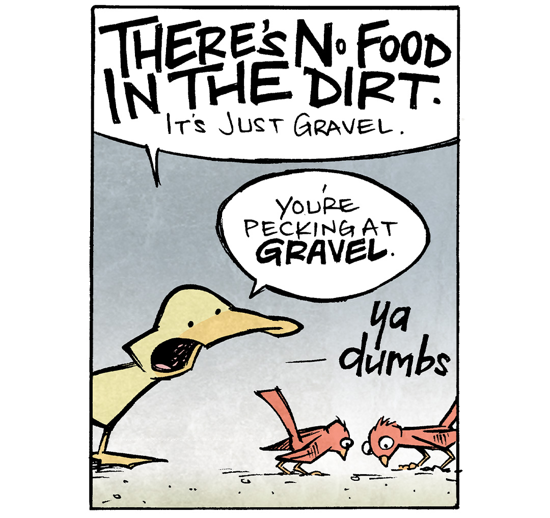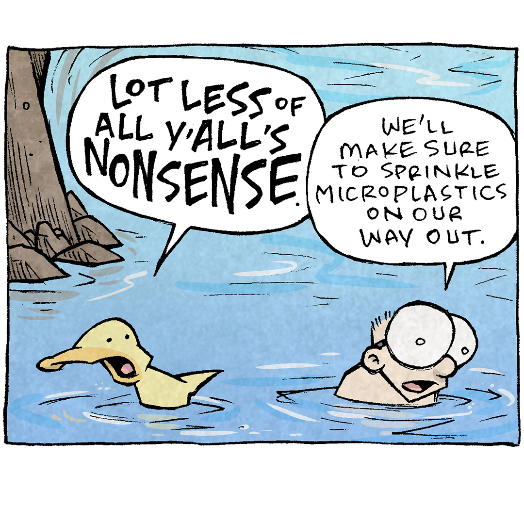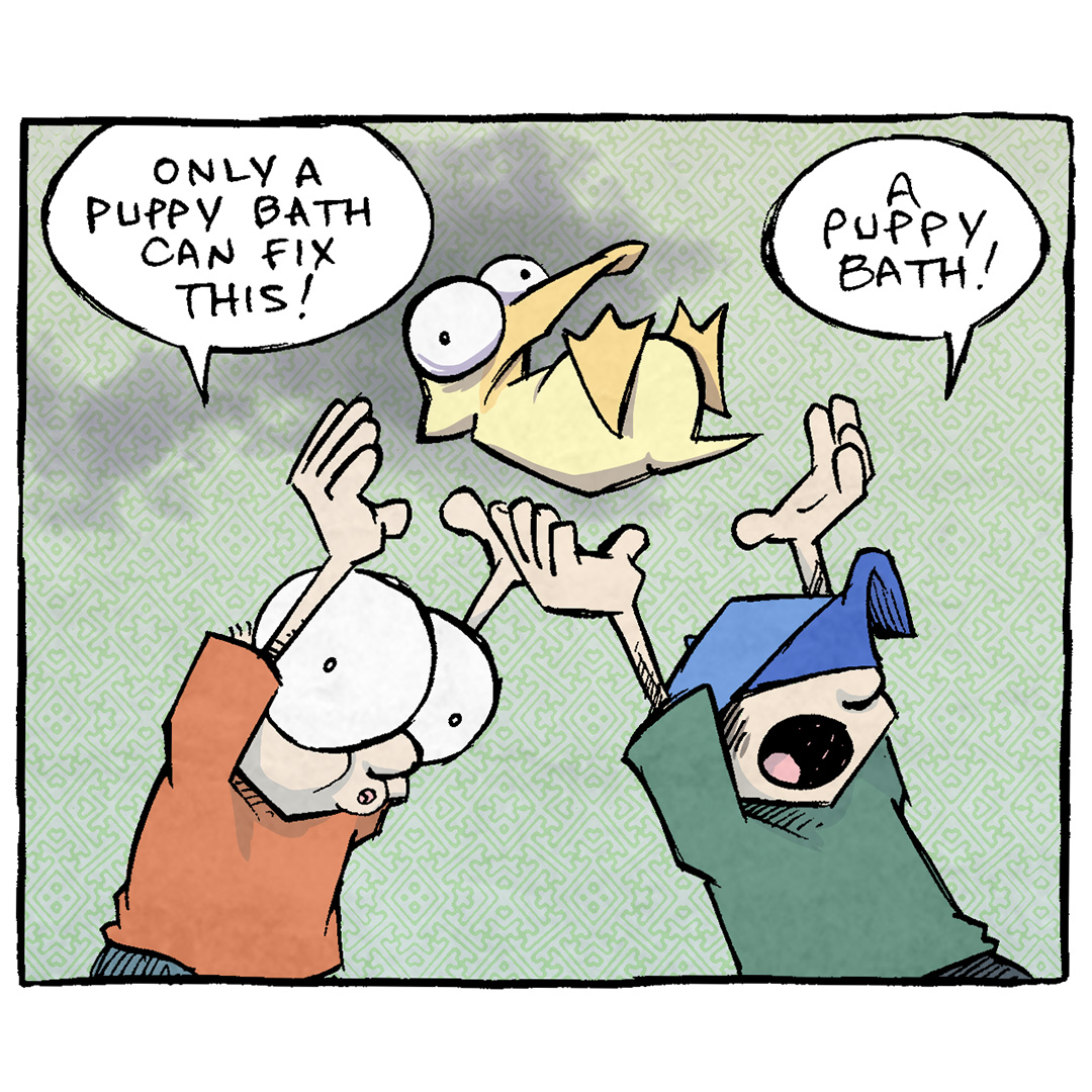 ![PANEL 1: ARTHUR, a yellow duck, is running along a blue background the fades to white. A single raindrop falls from the sky and falls on his head with a “ploink”