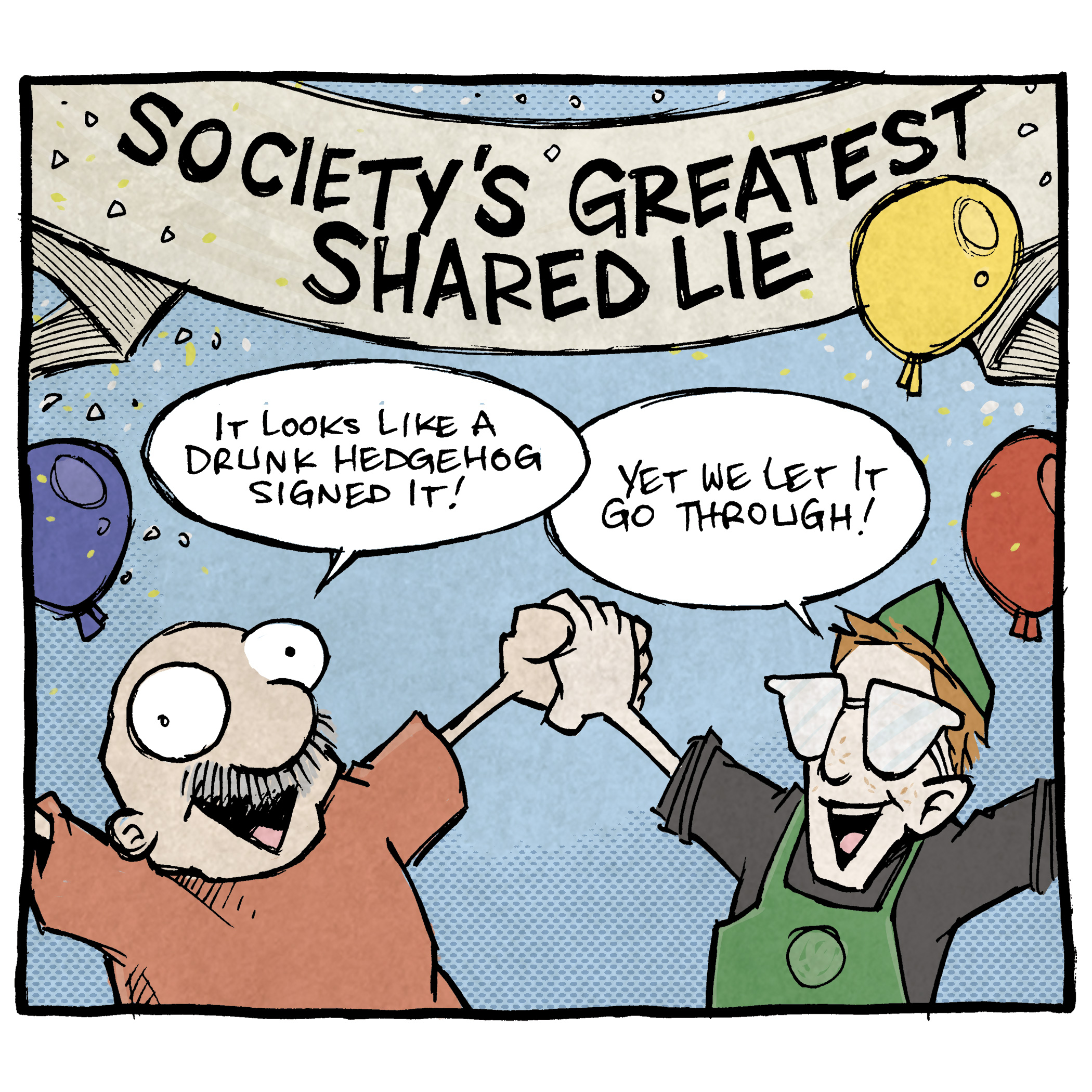 PANEL 3: A banner and balloons and confetti rain down on GRAMP and the young man as they look excited and join hands in celebration. The banner reads “Society’s greatest shared lie”