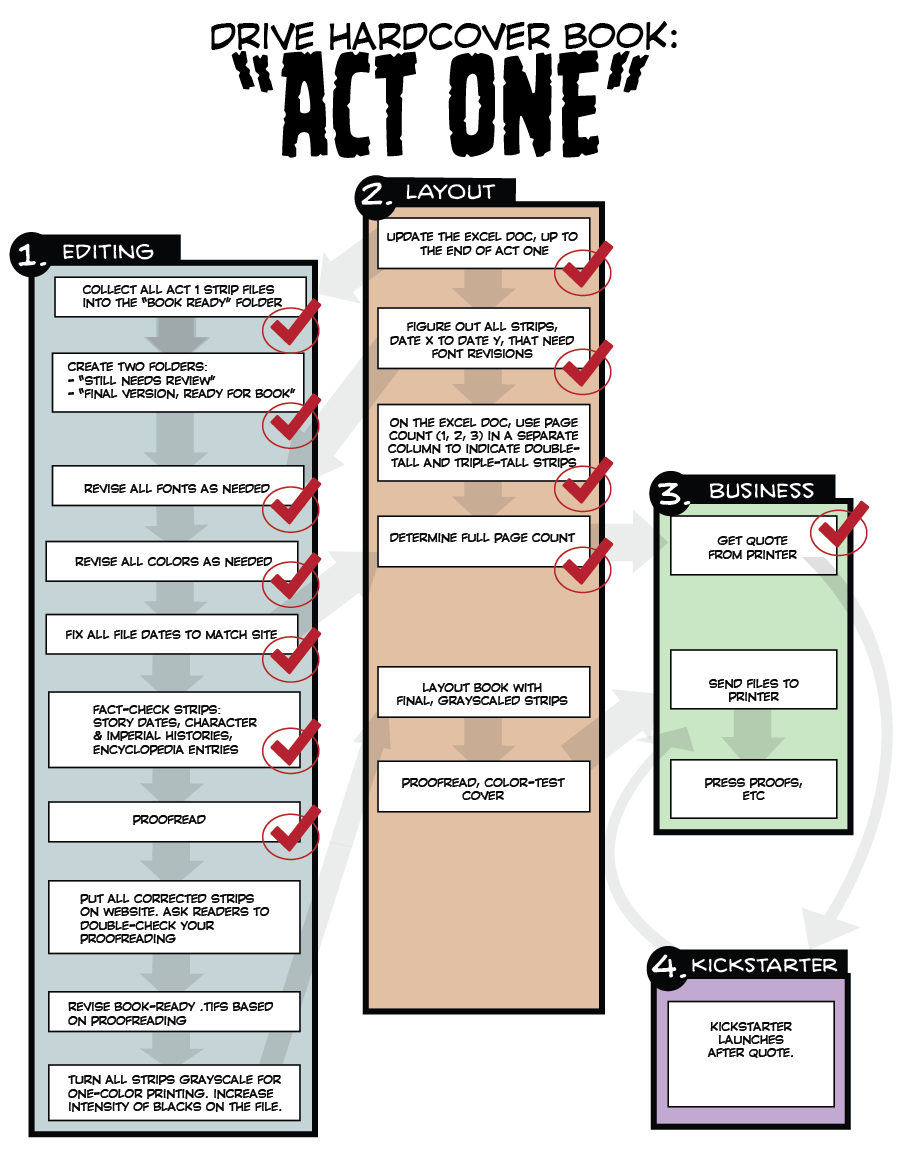 I really want the DRIVE hardcover book to look amazing, so I’m taking the time to go over each comic file with care. The story’s been told over 7 years, using *three* separate ways to draw the strip (ink, ink/digital hybrid, pure digital), and in the process transitioning between three different computers. So files are NEEDIN’ ORGANIZATION!