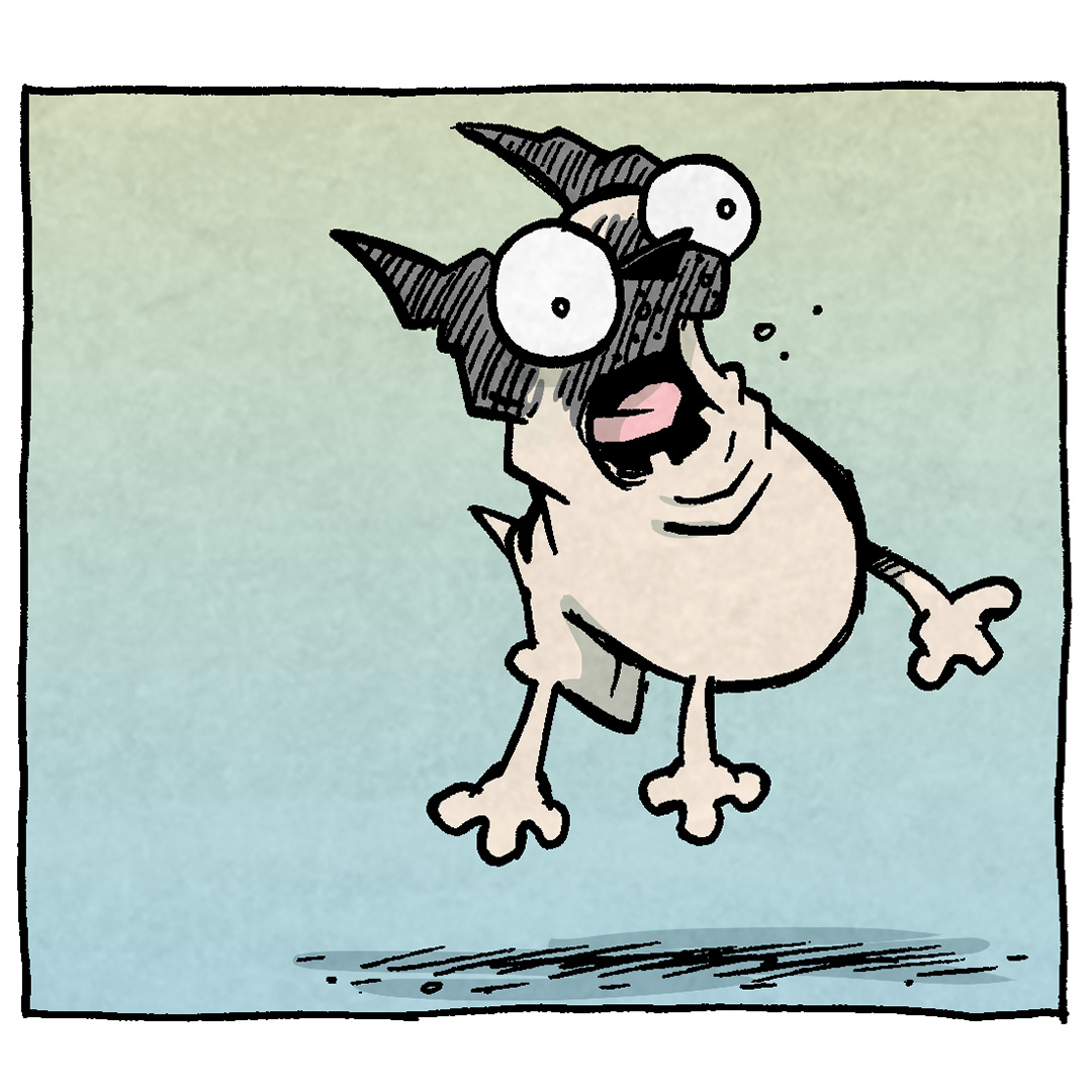 PANEL 5: The “Squigglin”, looing terrified, is now bright purple, blue and yellow.