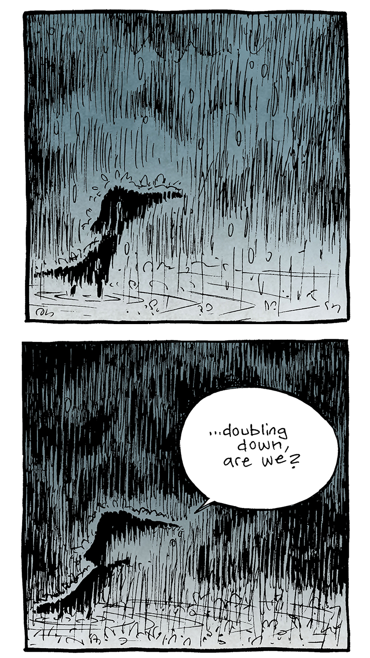 PANEL 6: Even HEAVIER raindrops and dark background.