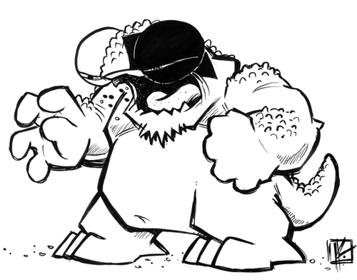 The piece is drawn in lightfast, archival inks on acid-free, Bristol stock. The cardstock itself measures 12″w x 9″h, while the drawn image is roughly 6.5″w x 5″h. And you’ll notice that, unlike the final strip version in the strip, this concept drawing has no shirt. So it’s kind of Nosh-as-a-an-Abercrombie&Fitch model, I suppose.