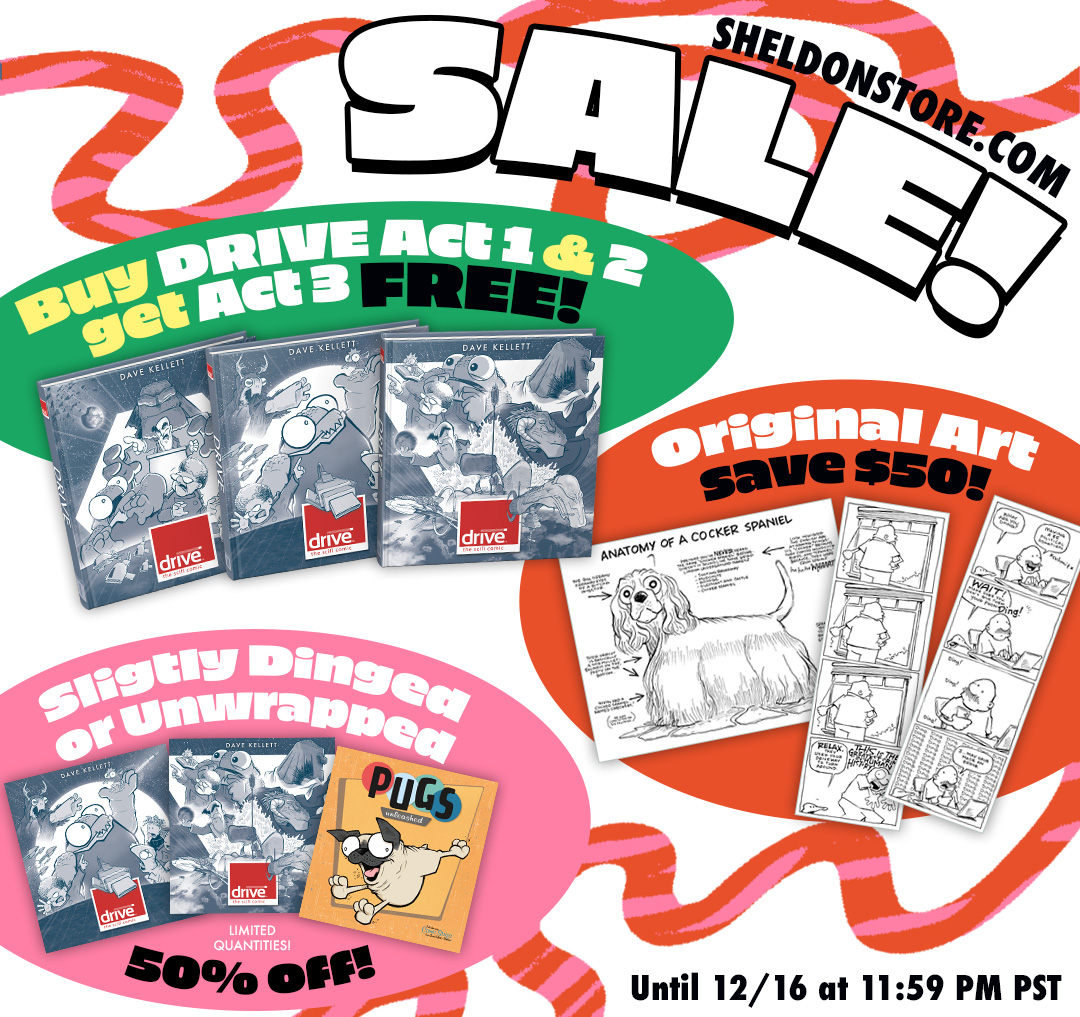 Also! I’m having a 50%-off sale on unwrapped and/or super-lightly-dinged copies of my books — including the family-favorite PUGS book, and my Drive books! Aaaaaand I’ll be signing these dinged books, to make ’em special! Here’s the direct link for all that: https://sheldonstore.com/collections/sale