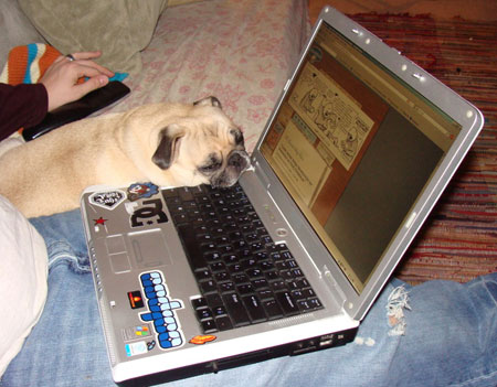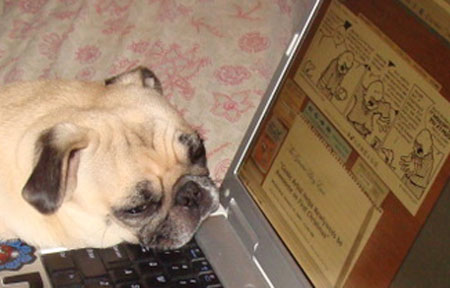 Sheldon reader Brandon sent in this photo of he and his pug Roxie “reading through the archives of our favorite comic”.