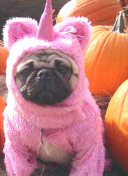 Pug Unicorns October 25, 2007 Seems Oso wasn’t the first pug to try on a unicorn costume. Check out this photo sent in by Sheldonista Victoria G. I love this guy’s face. It’s saying “My dignity…draining away…”