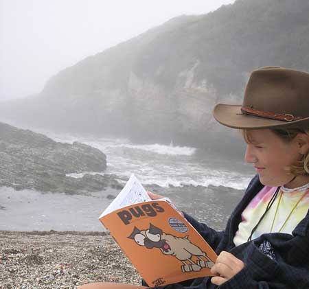 Barbara C. sent in this pic of her reading “Pugs” while on vacation at California’s Montana de Oro State Park. Apparently, the book has helped win over three of the four family members to becoming Sheldonistas. Dad’s the hold out. C’mon, pop.