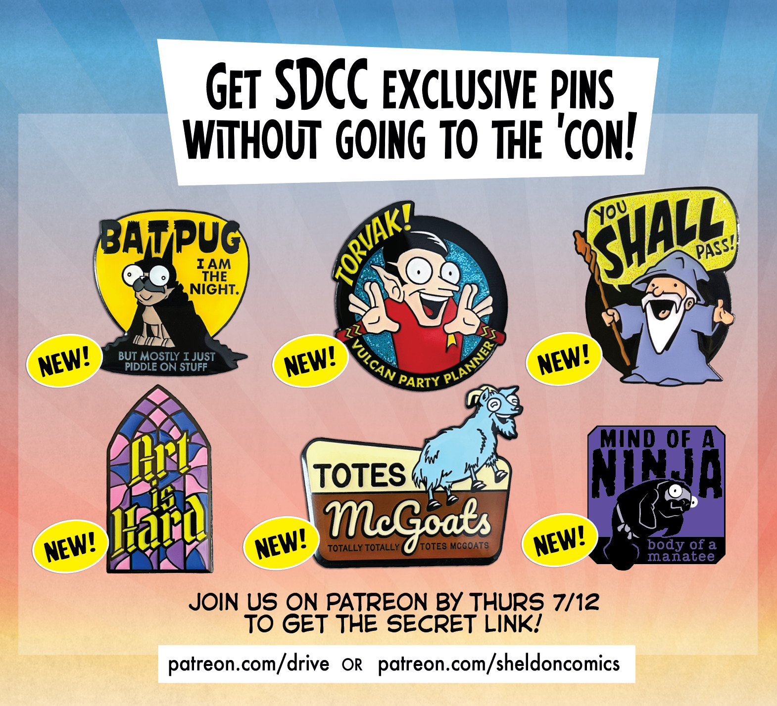 I have six new pins debuting exclusively at Comic-Con next week! But YOU can get them without travelling to San Diego, when you join on us Patreon by Thurs July 13th! On Friday I’ll be sending out the secret link to just the Patreon Pals™, where you can get ‘Con-Exclusive pins without going to the ‘Con!
