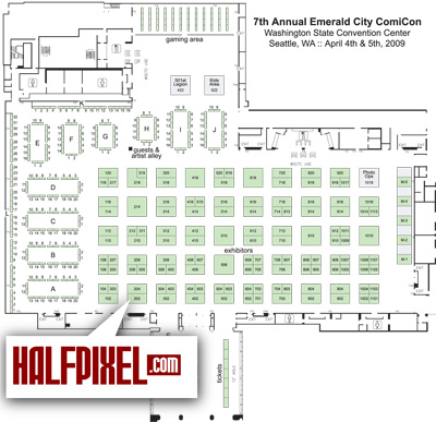 Also, here’s a rough ‘n ready map showing where I’ll be: Booth #202, right inside the front door. You can’t miss it: Just look for the two giganto-red “Halfpixel” signs. If you’re in the Pacific Northwest, make plans to be there!